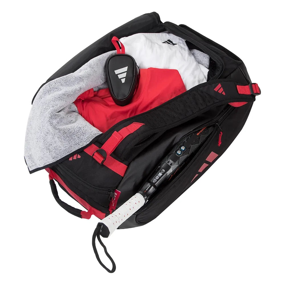 The ideal padel racket bag for your sports activities. With a large central zippered compartment on the back panel, you can conveniently store your clothing and equipment. In addition, it has two side pockets with thermal insulation, designed to protect and store up to two rackets per pocket, ensuring that your equipment is always in optimal condition. To keep your footwear separate and ventilated, this backpack includes a lower compartment with mesh ventilation, ideal for preventing odors and keeping your shoes fresh. You'll also find a small pocket at the top, perfect for storing personal items like keys or your phone. Comfort is key, which is why the backpack is equipped with two adjustable padded mesh straps, which will allow you to carry it comfortably and safely, regardless of the duration of your activity.